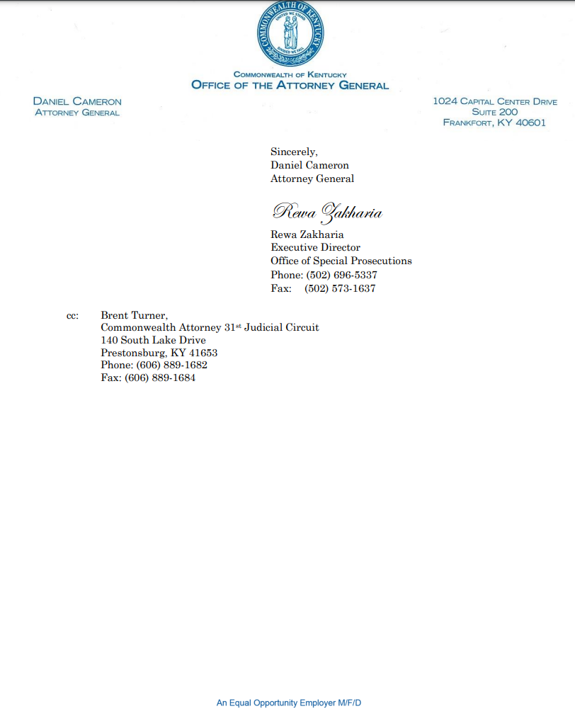 “The authority of the Office of the Attorney General to assume jurisdiction of a case or to appoint a special prosecutor is generally limited by KRS 15.200(1),” the letter says. “A county judge-executive is not one of the officials specified in the statute as someone with authority to request the appointment of a special prosecutor in a matter. The circumstances do not at present appear to call for a special prosecutor appointment, therefore the Office respectfully declines your request.”