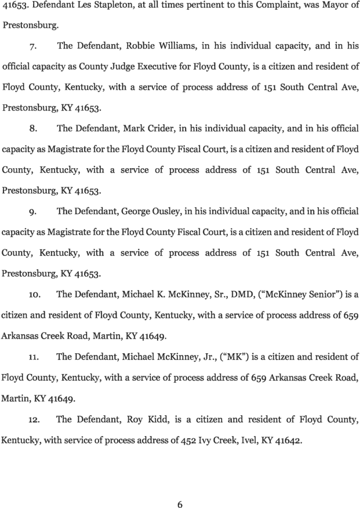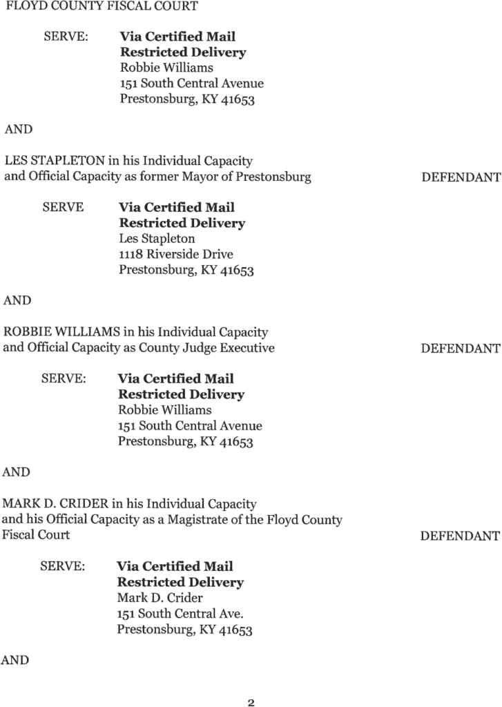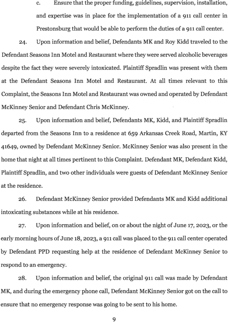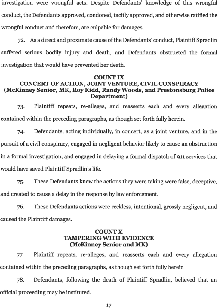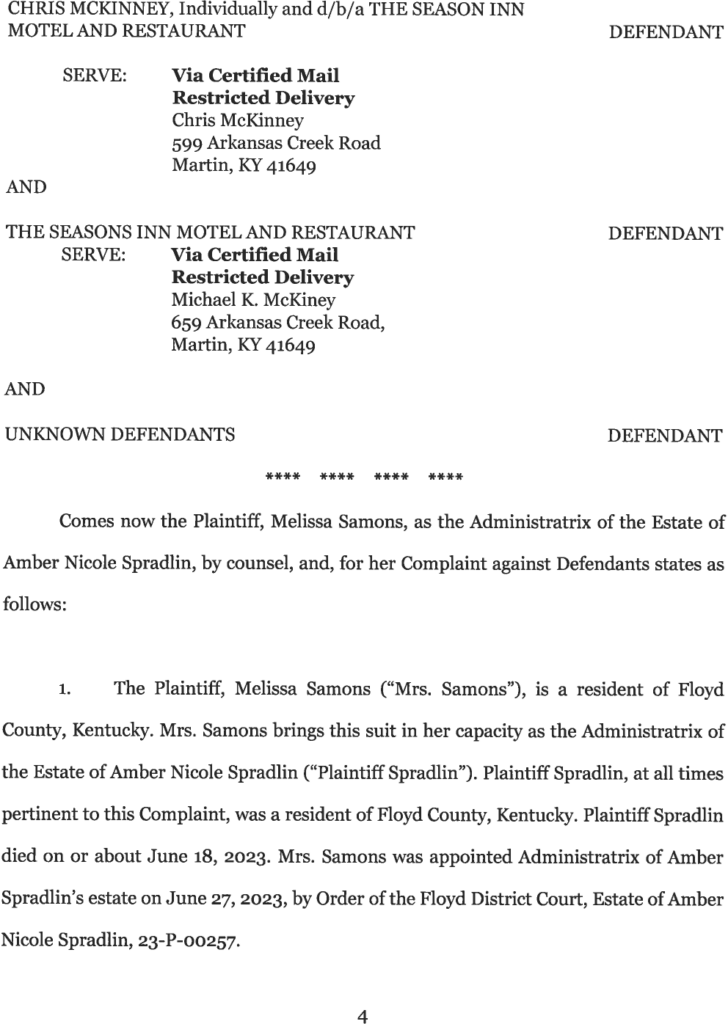 The lawsuit was filed by Melisa Samons, who is administratrix of Spradlin’s estate, against official defendants the City of Prestonsburg, Prestonsburg Police Department, former Prestonsburg Police Chief Randy Woods, former Mayor Les Stapleton, the Floyd County Fiscal Court, Judge-Executive Robbie Williams, and Magistrates Mark Crider and George Ousley, as well as dentist Michael McKinney, in whose home Spradlin died; his son, Michael McKinney Jr.; Roy Kidd; Chris McKinney; the Seasons Inn Motel and Restaurant; and other unknown defendants.