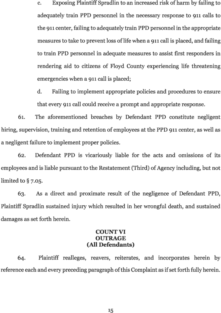 The complaint alleges that the county and city were negligent in transferring 911 service from Kentucky State Police to the City of Prestonsburg without making sure that Prestonsburg Police was “adequately prepared, staffed, funded and otherwise ready to handle 911 calls in an appropriate manner.”
