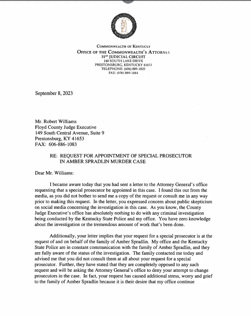 PRESTONSBURG, Ky. — Floyd County Commonwealth’s Attorney Brent Turner has weighed in on Floyd County Judge-Executive Robbie Williams’ request to Attorney General Daniel Cameron that a special prosecutor be appointed to oversee the murder case of Amber Spradlin.
