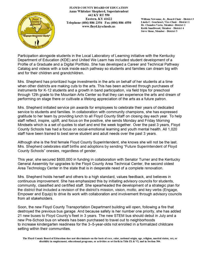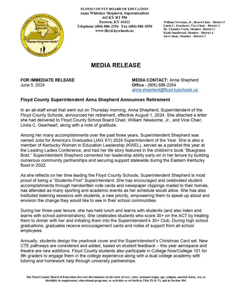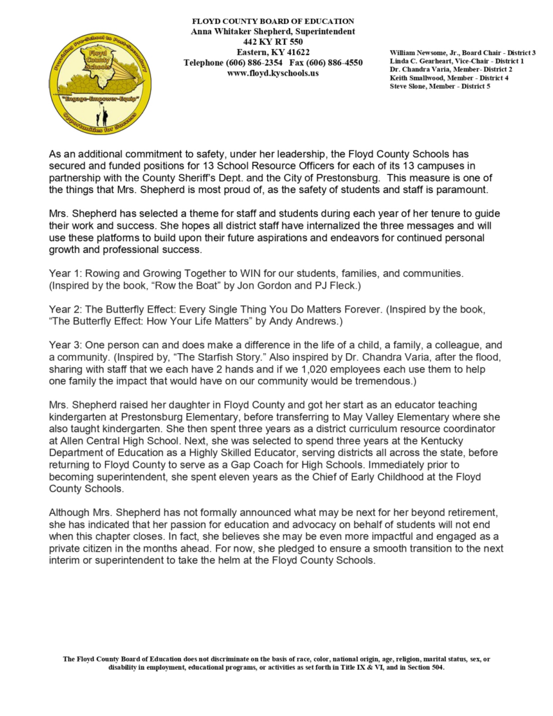 EASTERN, Ky. –Floyd County Schools Supt. Anna Shepherd has announced her retirement later this year.