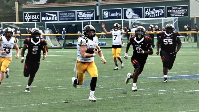 Running back Carter Conley ran for 180 yards on 13 carries and four touchdowns as the Golden Eagles improved to 2-0. Backfield mate Zack McCoart had a big game as well with 132 yards and a touchdown on just eight rushing attempts. McCoart also hauled in a 45-yard TD pass from quarterback Jacob Grimm.
