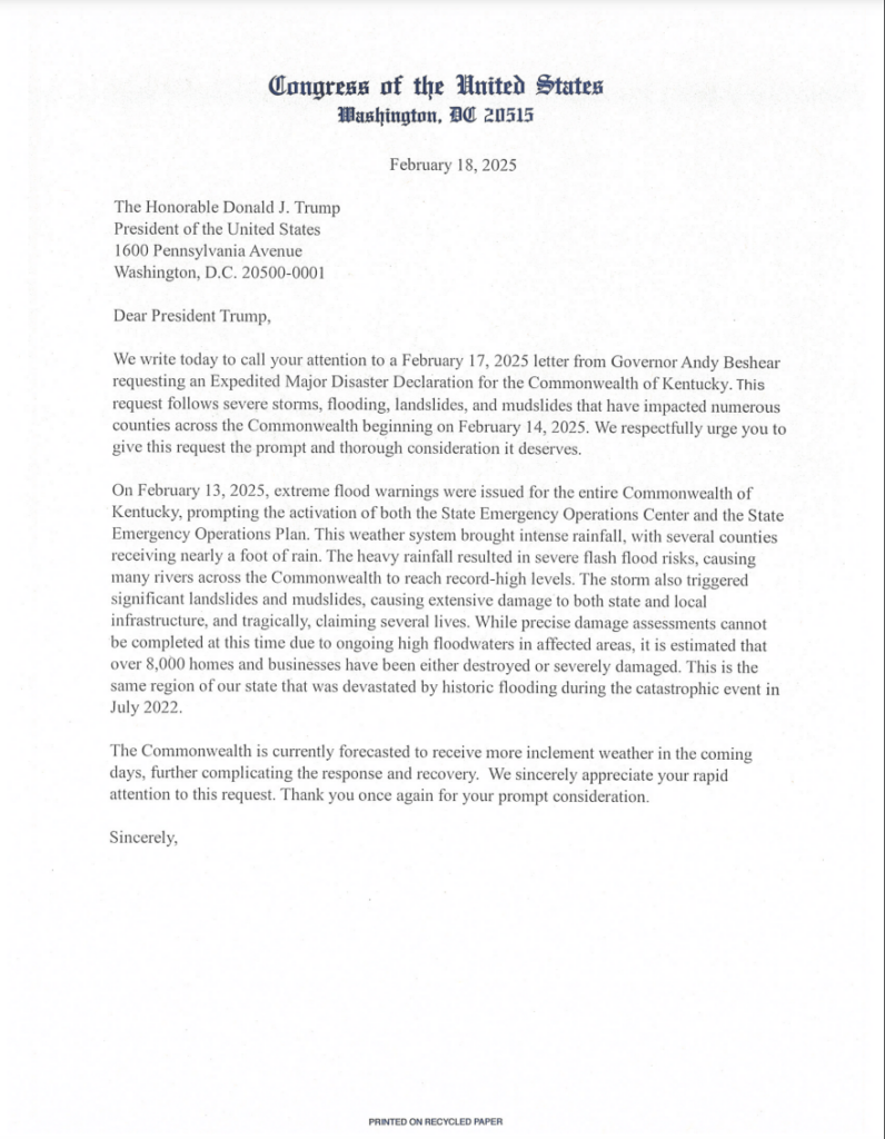 WASHINGTON, D.C. — Kentucky’s entire congressional delegation has united in bipartisan fashion to ask President Donald Trump to approve Gov. Andy Beshear’s request that the president issue a major disaster declaration for the recent flood.