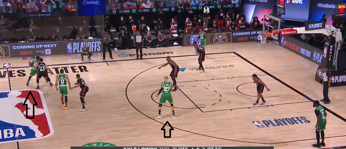 Once Brad Wanamaker angles his body to barricade VanVleet from Ibaka’s screen, VanVleet has a clear driving lane to his right — away from the pick. One hard dribble at Robert Williams, and VanVleet drags both defenders deep enough to give Ibaka an open triple — or force Boston to send a third defender at Ibaka, opening things elsewhere.