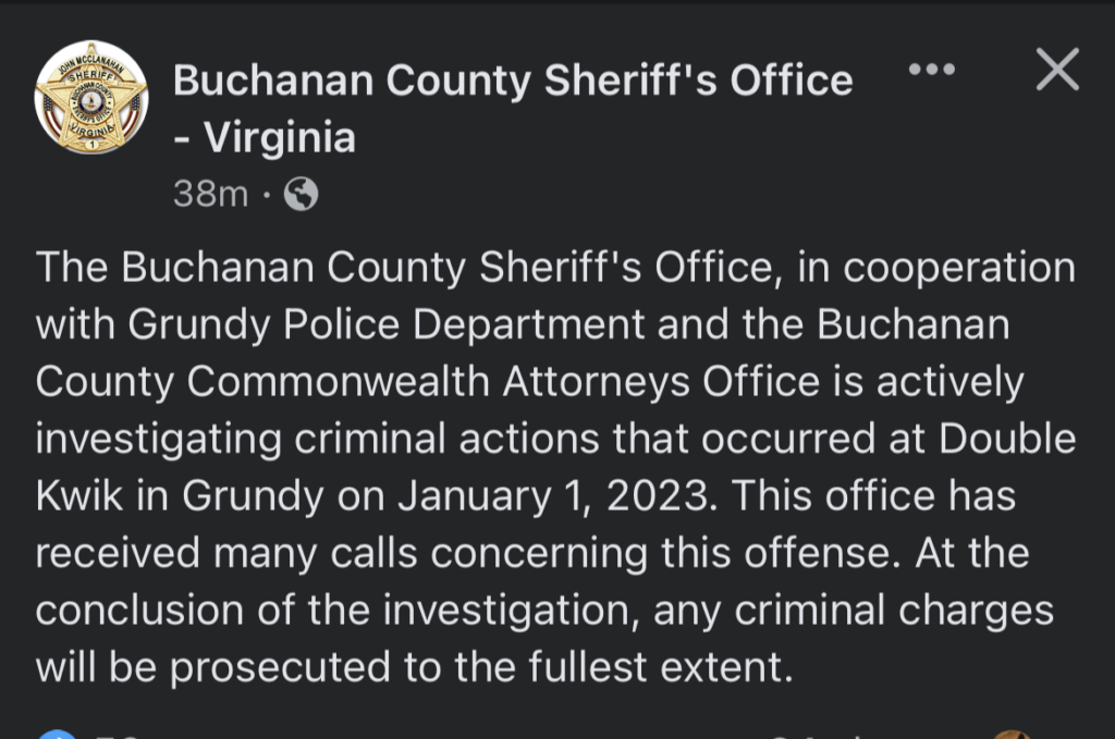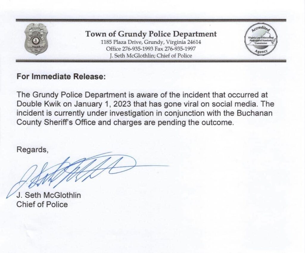 The Buchanan County Sheriff’s Office also released a statement, reporting it has received many calls about the incident and saying it is working with Grundy Police and the Buchanan County Commonwealth’s Attorney’s Office regarding potential prosecution.