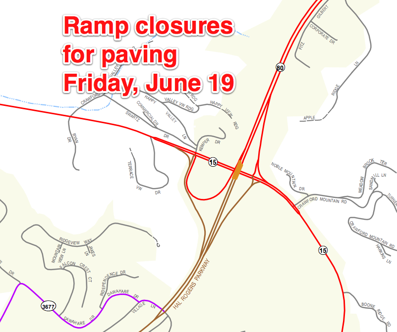 According to Kentucky Transportation Cabinet Highway District 10, the ramps at the Ky. 15 and Ky. 80-Hal Rogers Parkway interchange north of Hazard will be closed for blacktopping on Friday. The blacktopping is part of the project to widen Ky. 15, Highway District 10 says, and drivers will need to find an alternate route to move between the two highways.