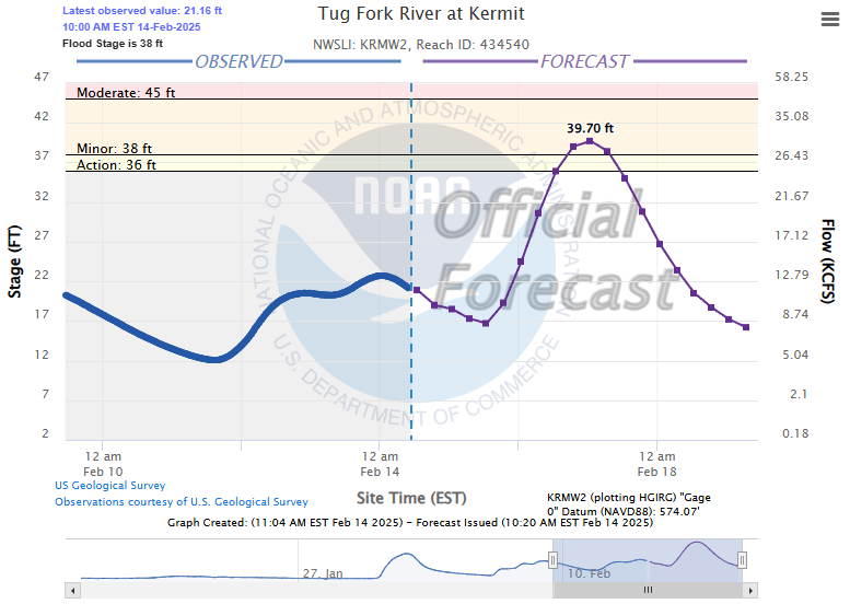 As of 11 a.m. Friday, the National Water Prediction Service is forecasting “minor flooding” Sunday in Williamson and Kermit, while Paintsville could see river levels briefly top at a few inches above “moderate flooding” stage on Sunday, before dropping back to “minor flooding” Monday morning. River levels in Pikeville and Prestonsburg are only supposed to rise to the “action stage.” On down river at Fullers Station, near Louisa, water levels are not projected to rise above normal levels. None of the communities in the immediate area is expected to sustain “major flooding” levels.