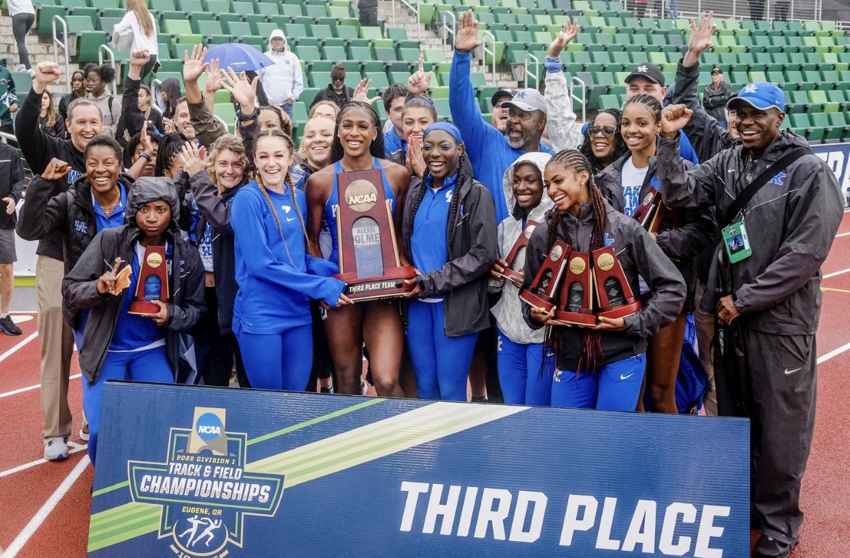 The Kentucky women’s track and field team finished third at the NCAA Outdoor Championships with 50 points, led by Abby Steiner’s 200-meter individual title in collegiate-record time, and 4x400m relay of Karimah Davis, Dajour Miles, Steiner and Alexis Holmes’ event crown on Saturday at Hayward Field.